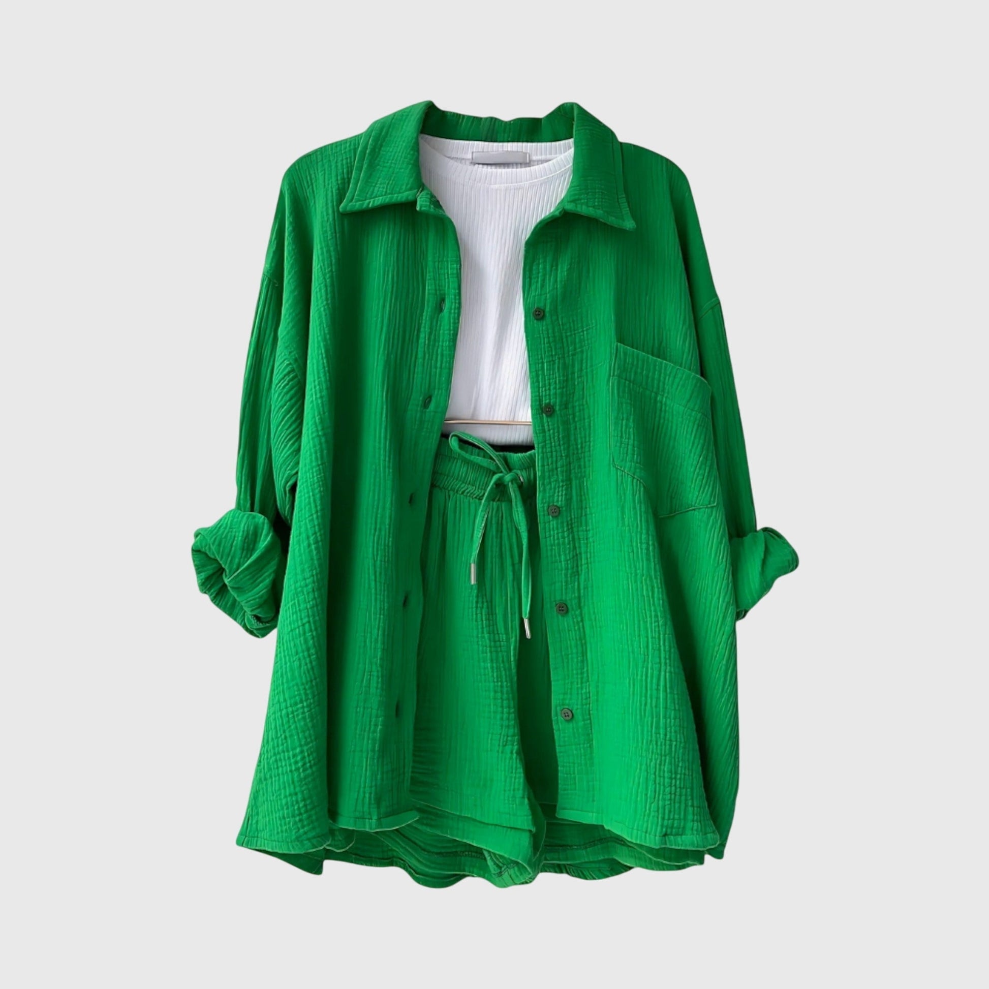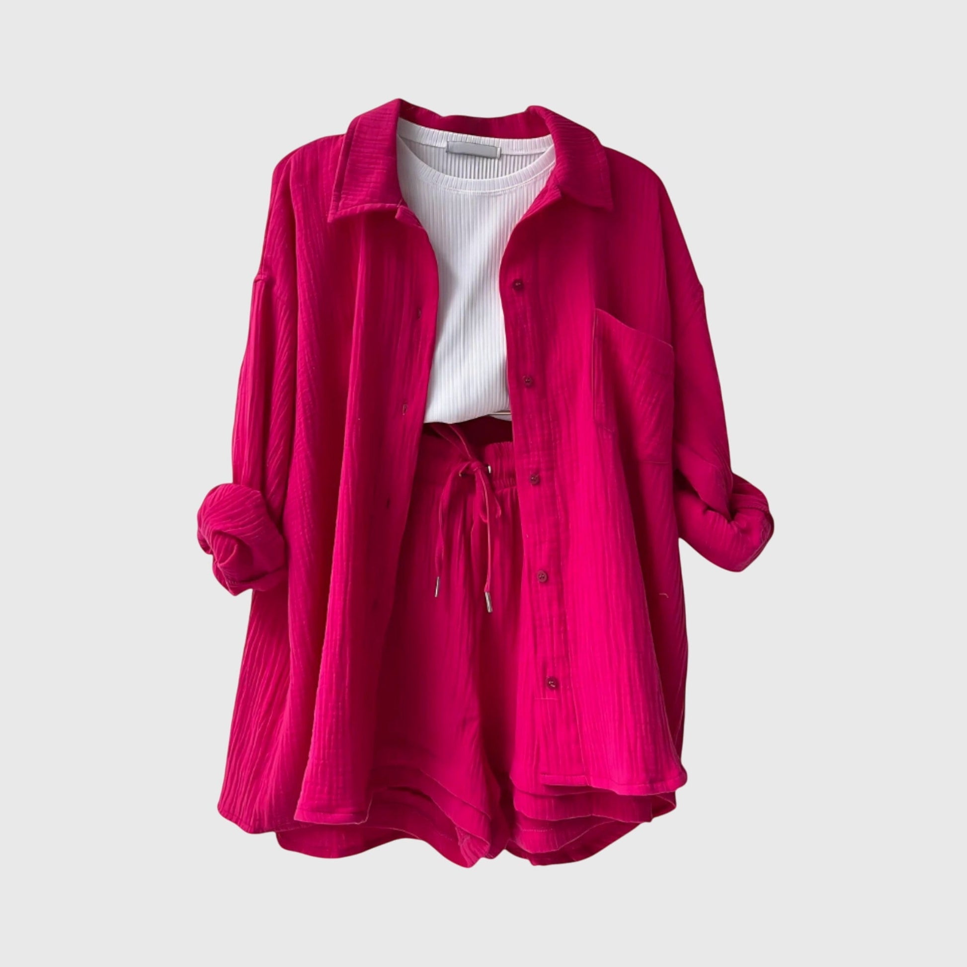 El conjunto estructurado Miley con botones combina elegancia y comodidad en un diseño pensado para los días cálidos de verano. Ligero y versátil, resulta apropiado tanto para jornadas tranquilas en casa como para salidas y vacaciones.