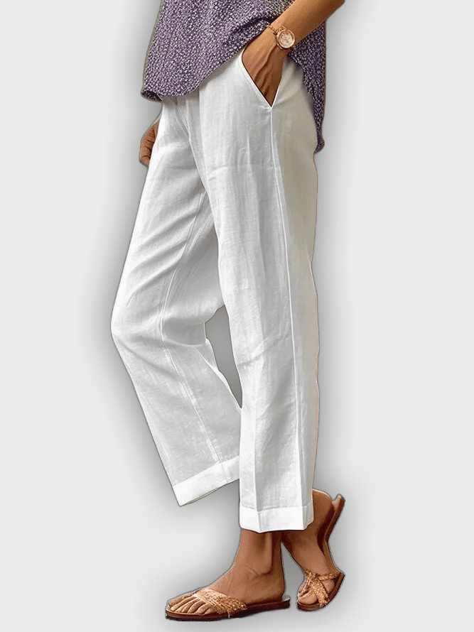 Pantalones cómodos de mezcla de algodón y lino diseñados para un ajuste relajado y pensados para el uso diario. Con cinturilla elástica ajustable y un corte holgado, ofrecen una sensación confortable tanto para estar en movimiento como para descansar en casa.
