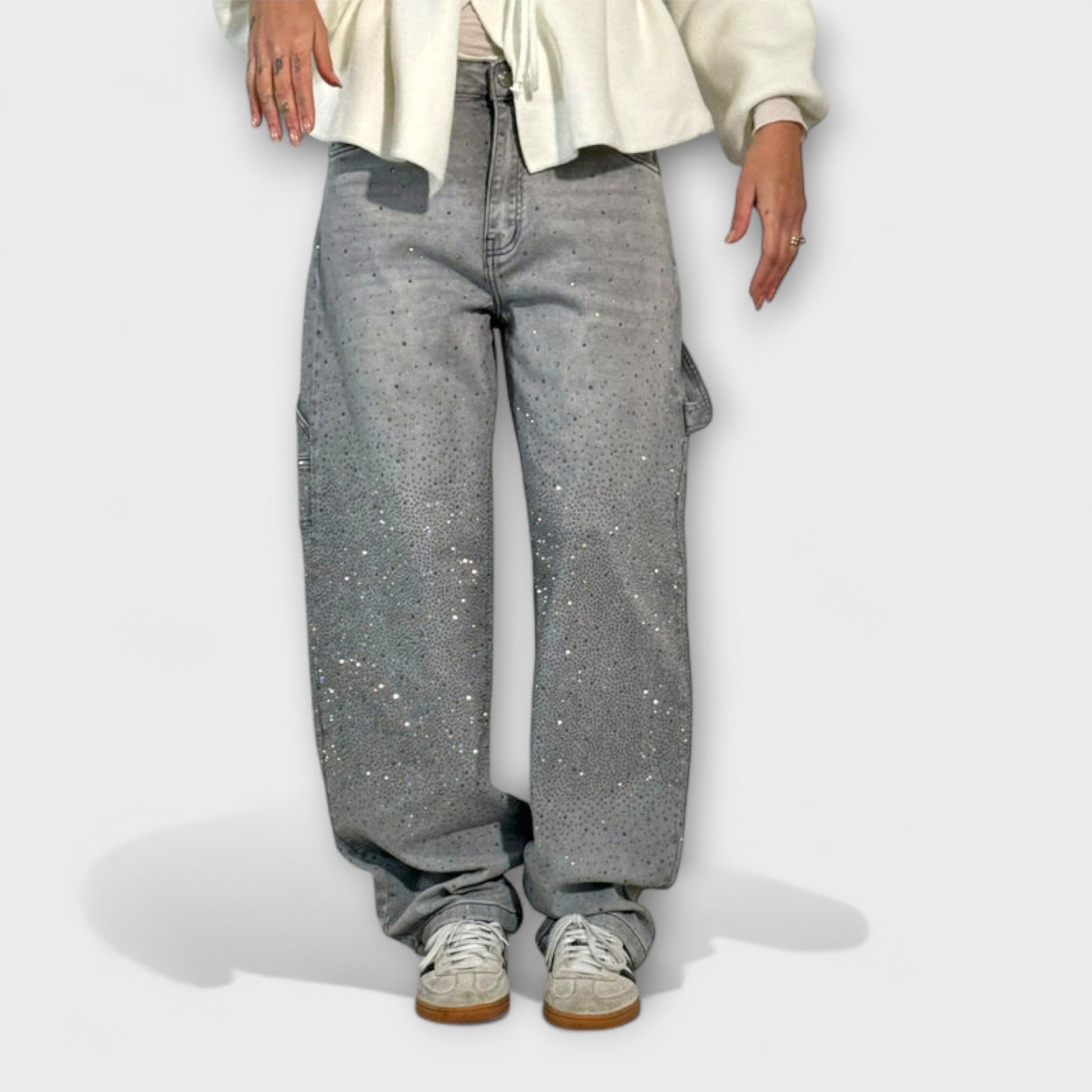 Estilo distintivo: El ajuste balloon y los detalles brillantes de diamante realzan cualquier look con un aire moderno y llamativo.
