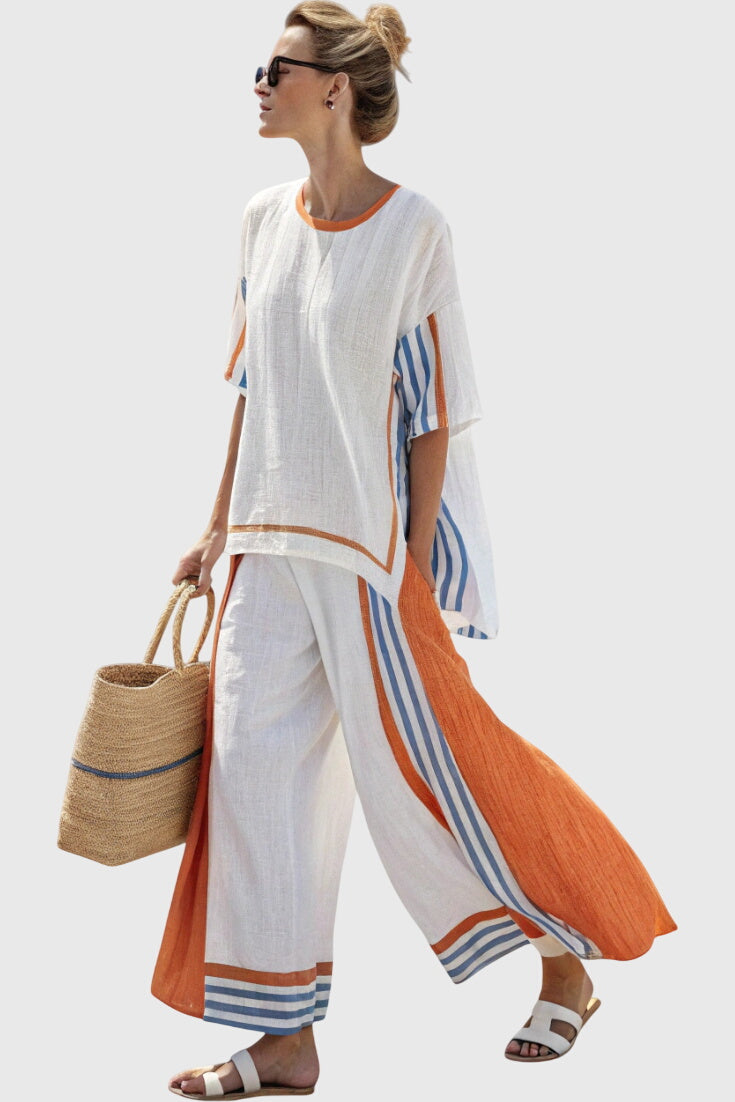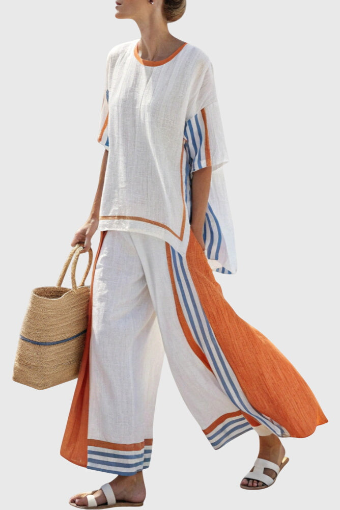 El conjunto Daisy ofrece una sensación de ligereza mediterránea y realza tu estilo personal con un diseño de líneas limpias y rayas verticales que afinan la silueta. Su corte amplio y espacioso, junto al tejido suave y fluido, garantiza comodidad y frescura para el uso diario.